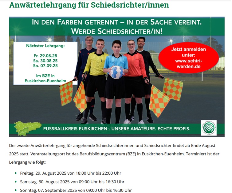 Du bist mindestens 14 Jahre alt motiviert und sportlich interessiert am Fußball. Der Kaller SC bietet Dir eine kostenfreie Schiedsrichtererstausstattung und optimale Betreuung durch einen erfahrenen Schiedsrichter.